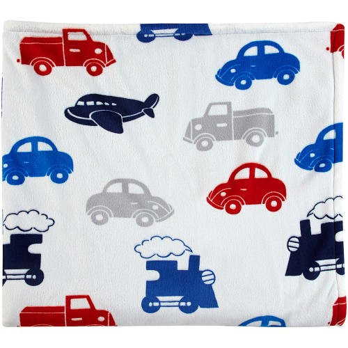 The Pinwheel On the Go Printed Velboa Blanket will keep babies cozy, comfy and delighted. It is reversible, featuring a playful print of cars, trucks, trains and planes on one side and a soft solid navy on the reverse. It coordinates well other bedding and decor pieces from the Pinwheel On the Go nursery collection (sold separately). This 100-percent polyester blanket is easy to wash and maintain for years of use. It makes a wonderful addition to your nursery or a keepsake gift for baby showers. use only non-chlorine bleach if needed