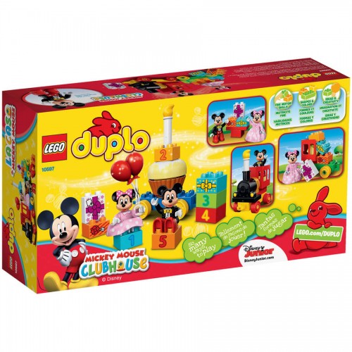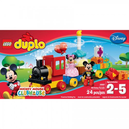 Important Made in USA Origin Disclaimer: For certain items sold by Walmart on Walmart.com, the displayed country of origin information may not be accurate or consistent with manufacturer information. For updated, accurate country of origin data, it is recommended that you rely on product packaging or manufacturer information.All aboard the Mickey Mouse Clubhouse birthday train as Mickey and Minnie throw a parade in your honor! Load up the train with everything you need for the perfect birthday party — a buildable cake, balloons and decorated gift bricks. How old are you today? With decorated age bricks numbered from 1 to 5, Mickey and Minnie can bring birthday fun year after year. Young children will love the endless birthday role-play opportunities and developing their construction skills with the big, bright LEGO DUPLO bricks designed especially for budding builders. Includes two LEGO DUPLO figures: Mickey Mouse and Minnie Mouse.