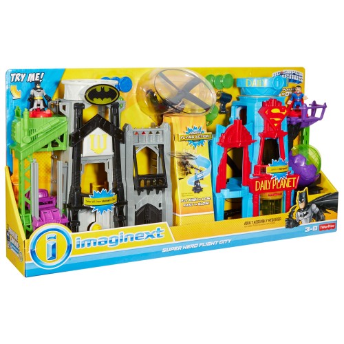 Important Made in USA Origin Disclaimer: For certain items sold by Walmart on Walmart.com, the displayed country of origin information may not be accurate or consistent with manufacturer information. For updated, accurate country of origin data, it is recommended that you rely on product packaging or manufacturer information.Young Super Heroes' imaginations will be flying high when they combine two worlds into one with the Imaginext Super Hero Flight City playset. 4 Power Pads get the action started. Turn the top Power Pad on the Gotham City side to have kids' favorite Super Hero take flight. Just load Superman or Batman into the flight pack and have him circle the city looking for trouble. (The Power Pad works just like a remote. How kids turn it determines how high or low or fast or slow the flight pack goes. It even provides 360-degree flying action!) Spot trouble below? Turn the second Power Pad to reveal a projectile launcher that can do battle with any villain. "Ha, ha, ha. Hello, Batman!" Don't forget about The Joker who has his own elevator and pie launcher that shoots 4 discs in a row by pushing the trigger. He could break into Wayne Manor through the secret door in back! Catch The Joker once and for all by activating the trap door on the landing pad.