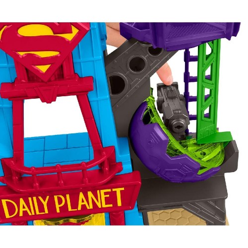 Now head down and log into the batcomputer – your mission is complete! (The Joker figure sold separately.) Superman and Lex Luthor have their own cool gadgets, too! Turn the third Power Pad on the Metropolis side to turn the Daily Planet into a landing pad. And turn the fourth Power Pad to open up Lex Corp. and unveil another projectile launcher. Uh, oh, Lex Luthor is on the loose! Catch him on the landing pad and put him away for good in the Metropolis jail. (Just make sure he doesn't escape through the secret hatch!) (Lex Luthor figure sold separately.) Imaginext … Turn on Adventure!
