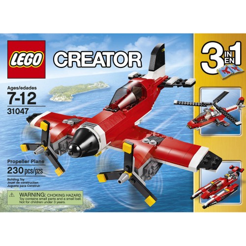 FeaturesHelicopter measures over 3" (8cm) high, 10" (26cm) long and 7" (20cm) wide, Propeller Plane measures over 4" (11cm) high, 7" (19cm) long and 9" (25cm) wide, Features spinning propellers, retractable wheels and an opening cockpit with room for a minifigure (not included), Hydroplane measures over 1" (5cm) high, 8" (21cm) long and 4" (11cm) wide