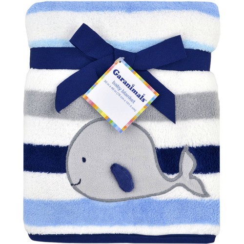 Important Made in USA Origin Disclaimer: For certain items sold by Walmart on Walmart.com, the displayed country of origin information may not be accurate or consistent with manufacturer information. For updated, accurate country of origin data, it is recommended that you rely on product packaging or manufacturer information.Your little one will adore this soft and warm blanket made with cozy fleece. The Garanimals Boating Buddies Fluffy Fleece Blanket features a friendly whale on white, grey and blue stripes. It's the perfect addition to your nursery or baby shower gift.