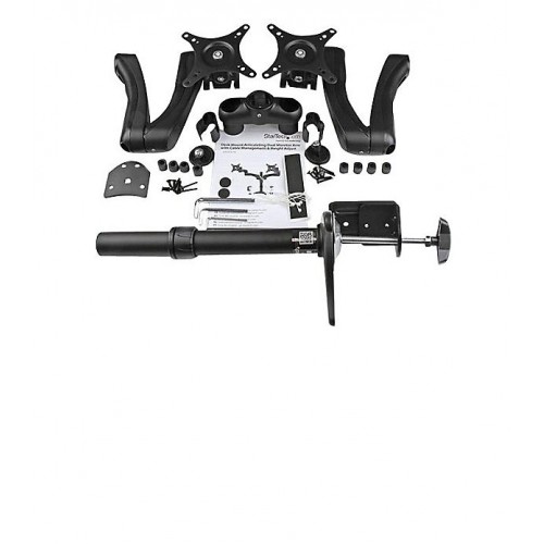 | Mount two displays on your desk surface or through a grommet, with adjustable height and cable management. The ARMDUAL Articulating Dual-Monitor Arm lets you mount two displays to your desk or table, with extension, tilt, pan, swivel, pivot and height adjustments. The desk-mount monitor arm offers a wide range of motion on several axes, giving you the freedom to place your displays side-by-side, spread apart, back-to-back or anywhere in between. For viewing longer pages or blocks of code without scrolling, the dual arm also supports landscape to portrait display rotation for either monitor. Mounting your displays on a dual monitor arm above the desk surface enables you to adjust your display height, position and viewing angles easily for an ergonomic work environment, with the added benefit of reclaiming valuable workspace on your desk. Supporting 12 - 24" displays up to a maximum weight capacity of 30lbs (13.6kg) per arm, the dual arm monitor mount holds your displays with ease, and integrates a cable management channel to keep things neat. For added installation flexibility, the included mounting hardware can either clamp to the side of your desk / table or mount through a grommet hole, for a versatile dual-monitor mounting solution. |